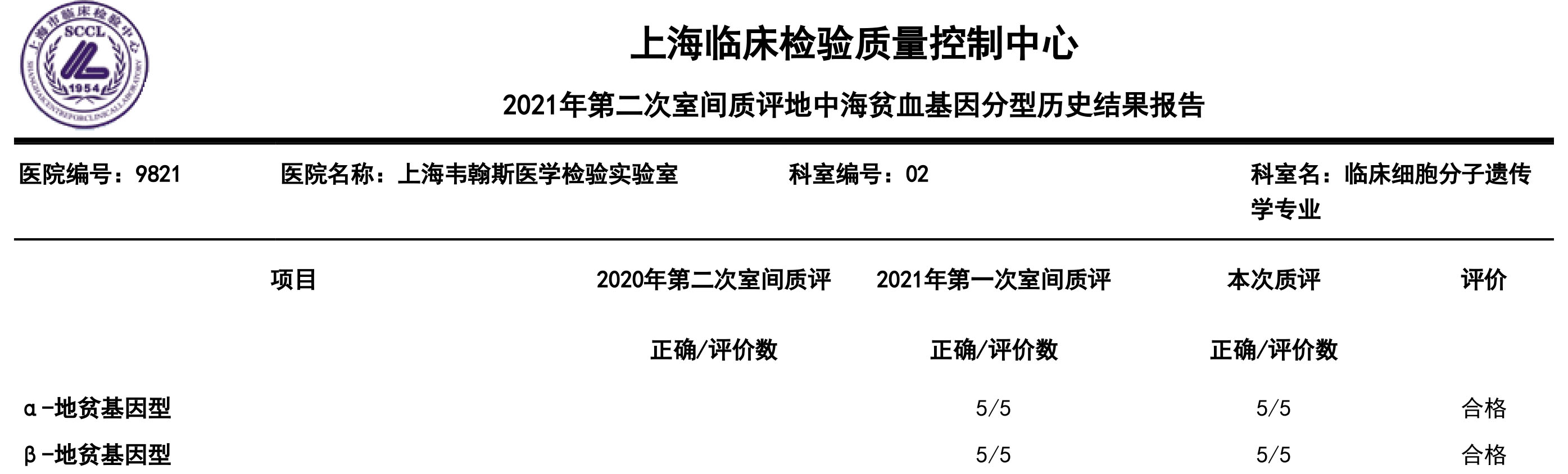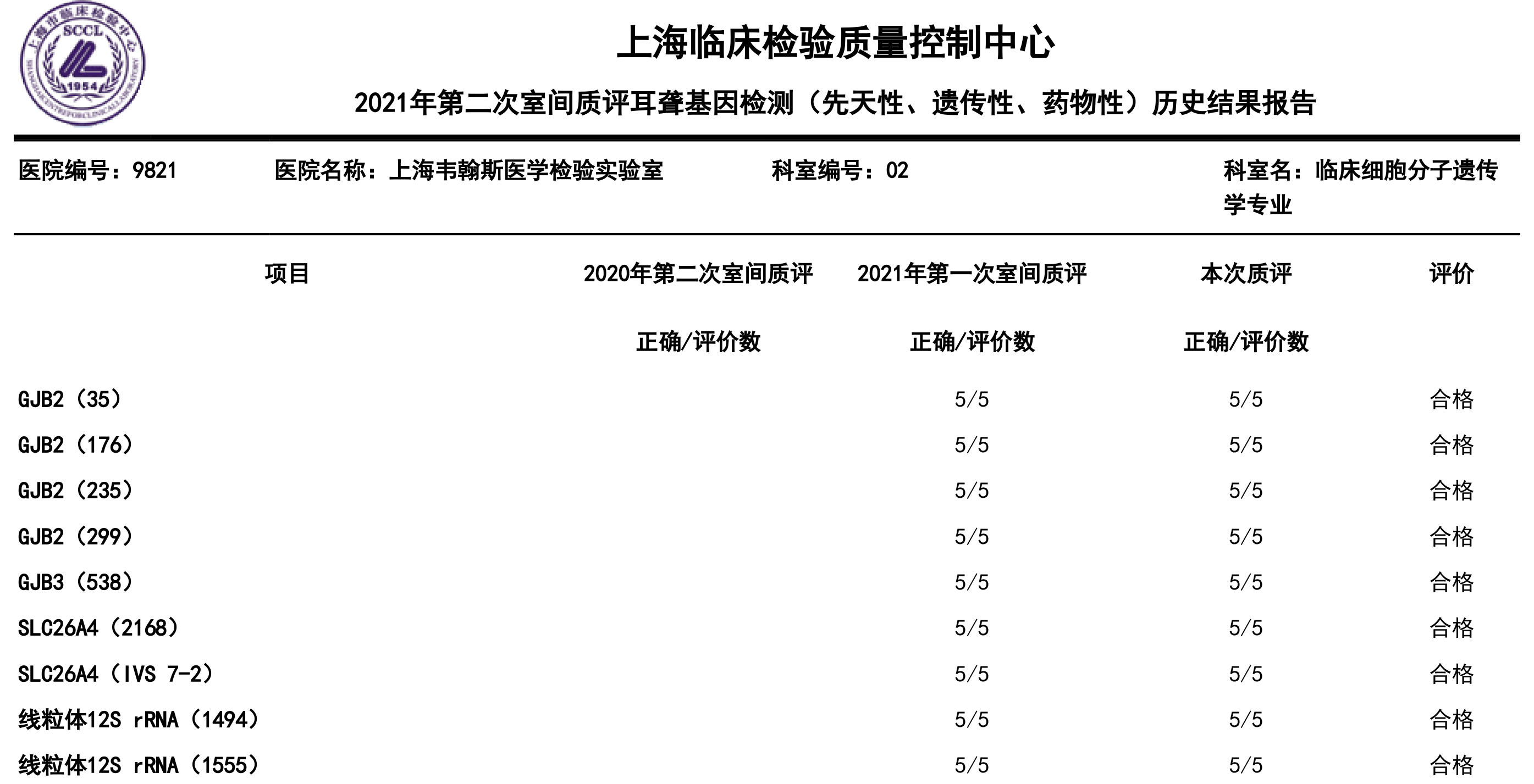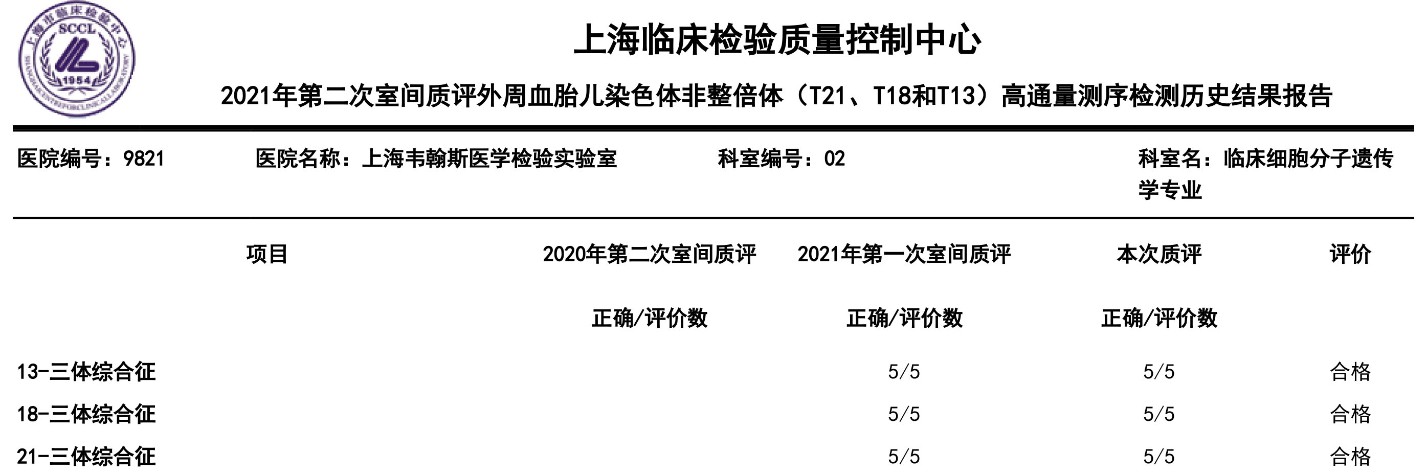 近日,上海市临床检验中心公布了2021年第二次室间质评结果报告。上海韦翰斯参加了“外周血胎儿染色体非整倍体(T21、T18、T13)、地中海贫血基因分型、耳聋基因检测(先天性、遗传性、药物性)”三个项目,全部满分通过。本次佳绩标志着韦翰斯生物的实验室检测、数据分析等各个环节始终保持着高稳定性及先进水平。