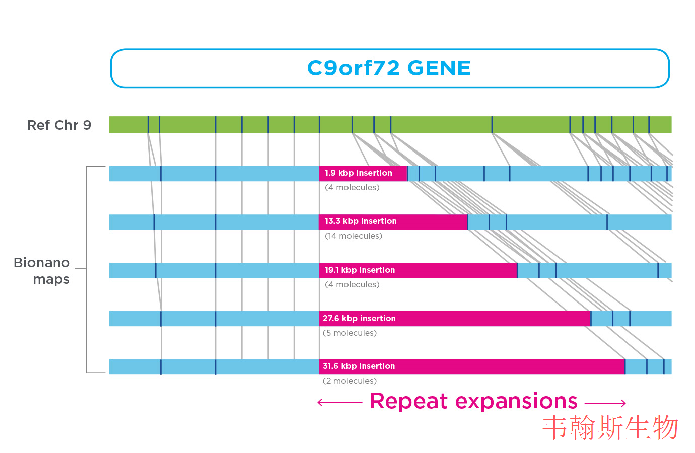 ● 结构变异(SVs)是人类基因组变异的主要组成部分,它推动了遗传多样性,但也导致了遗传疾病。SVs 的两侧经常有重复的序列,这对现有的测序技术来说是一个挑战或不可能破译的。Bionano 基因组成像显示 SVs 灵敏度高达99%(即使等位基因部分只有1%),这是其他基因组技术无法实现的。