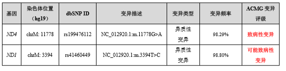 检测结果:对受检者进行高通量测序检测线粒体 DNA 全部序列,发现受检者2个错义变异 m.11778G>A 和 m.3394T>C,2个变异均可能导致线粒体遗传的Leber遗传性视神经病变(LEBER HEREDITARY OPTIC NEUROPATHY; LHON;OMIM#535000)。